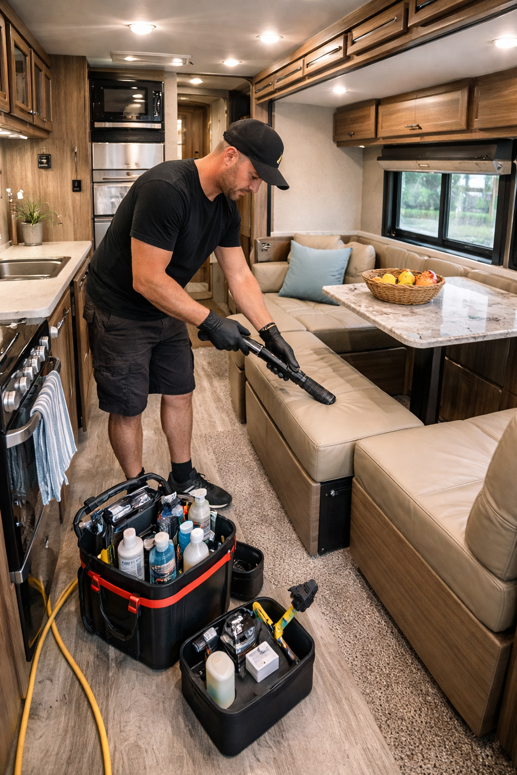 Exterior washes and interior cleaning done at your home, storage lot, or campsite.